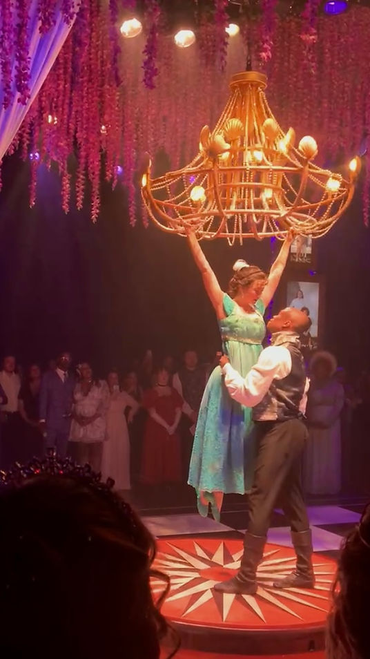 Introductions formally made, the queen leads a procession to another room. Black velvet curtains are parted to reveal a ballroom dance floor. An entire room has been hidden from view! All make their way to the ballroom, and are entertained by two incredibly talented dancers who reenact the duke and Daphne’s love story. The dancers perform acrobatics, use a swinging chandelier and Bridgerton-blue drapes, and involve the guests in the retelling of their romance. Commentary is provided here, too, by Lady Heretell.